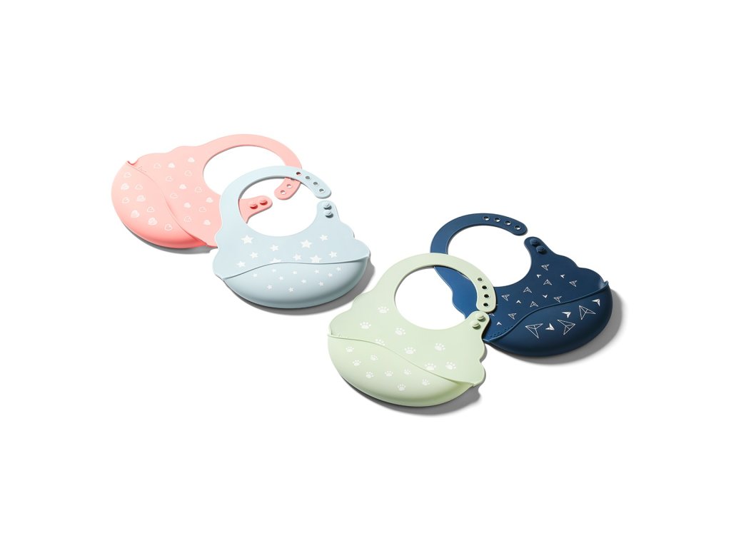 Mäkký a jemný podbradník účinne ochráni oblečenie vášho dieťaťa pred zašpinením pri jedle. Disponuje praktickým vreckom, ktoré zachytáva omrvinky. Podbradník je vyrobený z mäkkého, ľahkého a bezpečného materiálu. Ľahko sa udržiava v čistote a je vhodný do umývačky riadu. Je flexibilný, čo umožňuje jeho pohodlné zloženie do malej kocky, ideálny na umiestnenie do maminej tašky. Podbradník je nastaviteľný. Je vybavený ľahko uzatvárateľnými ozdobnými spojovacími prvkami v tvare srdca. Vďaka tomu je univerzálny a pohodlný. Bol vyrobený zo 100% ľahkého silikónu. Určený pre deti od 6 mesiacov