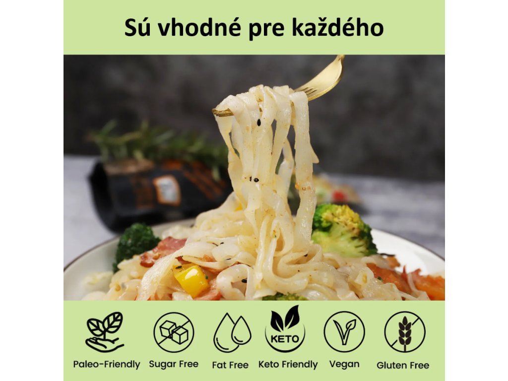 Konjac fettuccine je rýchla a všestranná ingrediencia — stačí ju prepláchnuť, krátko povariť alebo ohriať a použiť ako základ tradičných cestovinových jedál, polievok, šalátov alebo stir‑fry.