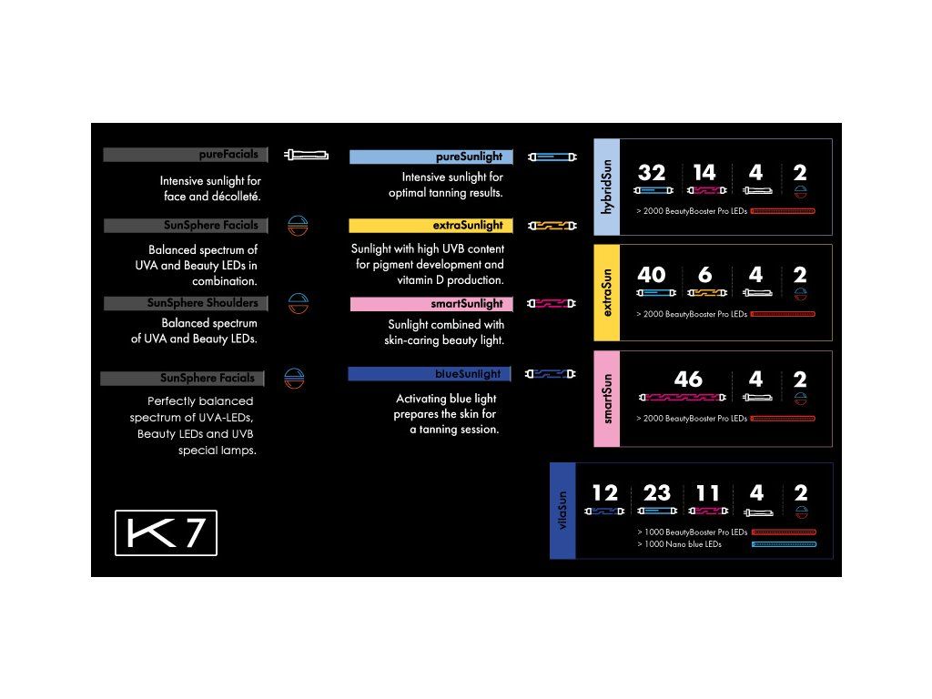 - K7S – vybavené modernejšími a výkonnejšími LED opaľovačmi tváre, ktoré zabezpečujú intenzívne a rovnomerné opálenie.