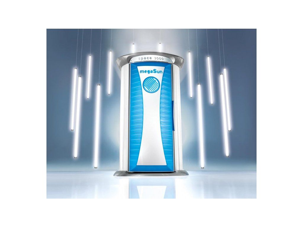Model MegaSun Space 3000 je moderné solárium, ktoré spája atraktívny dizajn, vysoký výkon a komfort pri opaľovaní. Jeho výrazný vzhľad dopĺňajú polkruhové obklady dverí a podsvietené logo MegaSun, ktoré elegantne zvýrazňuje jeho dizajn.